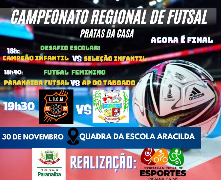 Neste sábado, dia 30, a Secretaria Municipal de Esporte e Lazer de Paranaíba realizará a grande final do Campeonato Regional de Futsal, com premiações para os times campeão (R$ 5.000) e vice-campeão (R$ 2.000).
