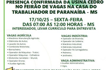 Entre as empresas participantes, está confirmada a presença da Usina Cedro, que disponibilizará vagas nas áreas agrícola, industrial e administrativa, com transporte exclusivo para colaboradores de Paranaíba.