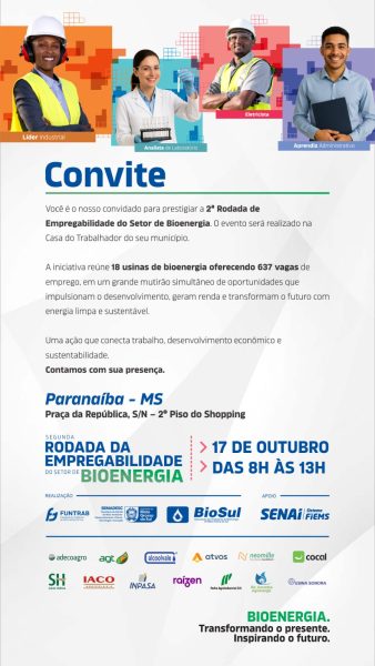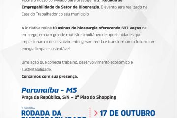 A Casa do Trabalhador de Paranaíba será palco, na próxima sexta-feira, dia 17, de um grande mutirão de oportunidades de emprego. O evento integra a 2ª Rodada de Empregabilidade do Setor de Bioenergia e o Feirão de Vagas da Usina Cedro – Pedra Agroindustrial S/A, reunindo diversas empresas do setor com o objetivo de conectar trabalhadores e empregadores.